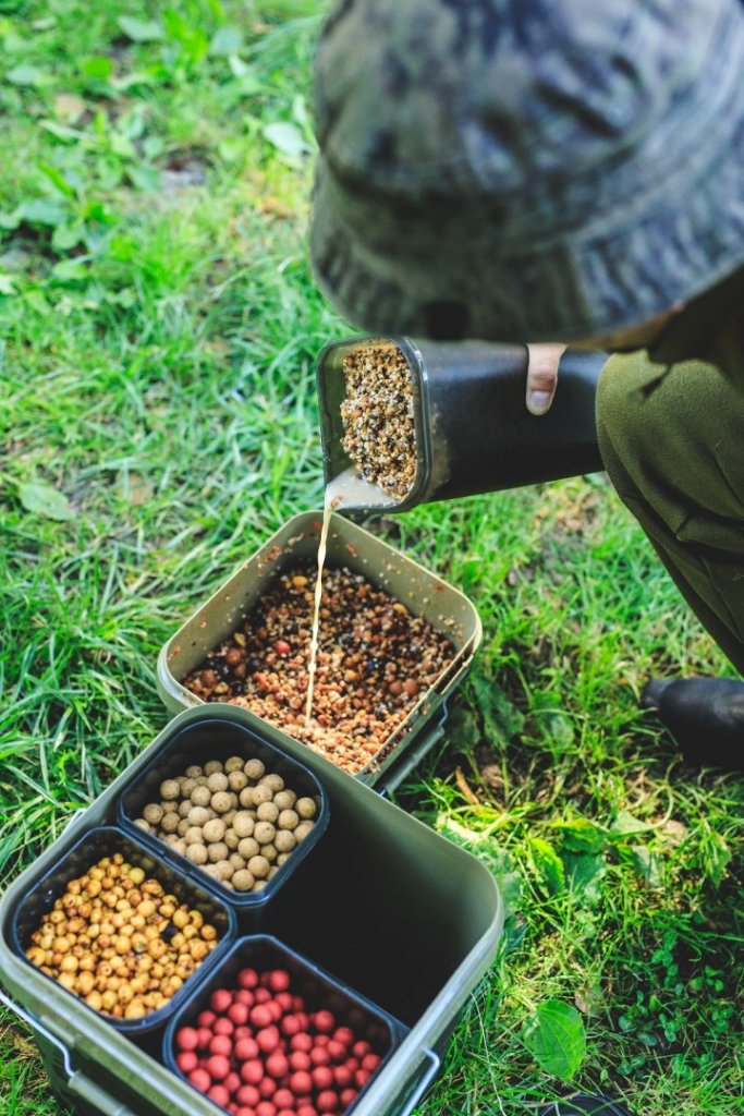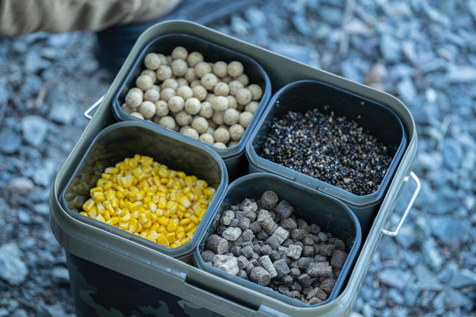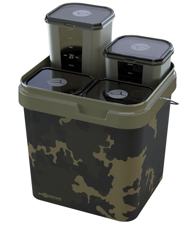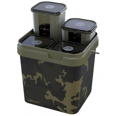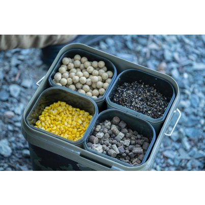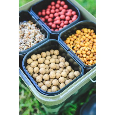 Tento praktický systém má objem 17 litrů a je dodáván se čtyřmi samostatnými boxy, z nichž každý lze naplnit něčím jiným a kde buď nechcete míchat všechny návnady dohromady, nebo je chcete připravit přímo na místě. Díky tomu je vhodný pro situace, kdy chcete krmit návnadami různých velikostí, a poskytuje vám snadný přístup ke všem návnadám v jednom kbelíku, avšak stále vám umožňuje mít vše rozdělené dle vaší potřeby – na rozdíl od toho, kdy je smícháte dohromady. Je také skvělý při použití spodových směsí, které obsahují drobné částice a pelety, a kde míchání předem může způsobit, že některé druhy krmení, jako je konopí, vyschnou a plavou, nebo se pelety rozpadnou více, než byste chtěli.