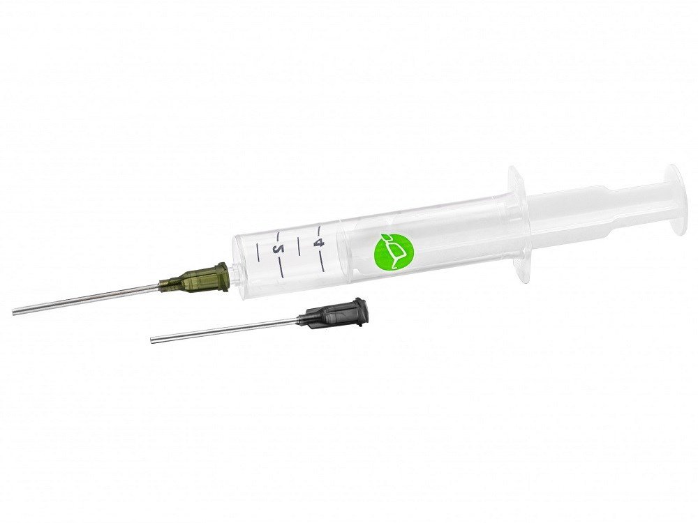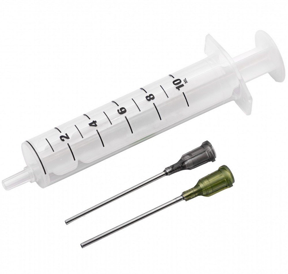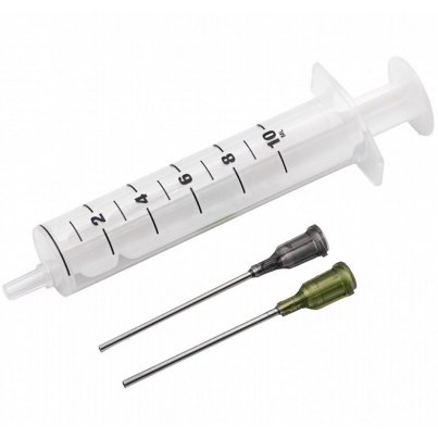 Injekční stříkačka má objem 10 ml a je označena po 1 ml. Dodává se is 2 x nehypodermickými nástavci různých velikostí: s malým a velkým otvorem.