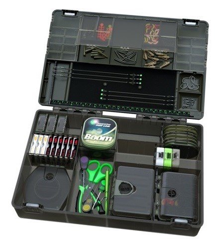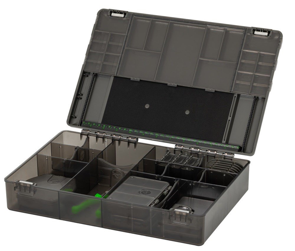 Trvalé stěny v boxu na náčiní jsou rozmístěny tak perfektně, aby se do nich vešly naše návazcové šňůrky, Sady krabiček, Bait Floss, Leadcore, Arma Kord, Leader Safe pouzdro a krabičky Kamakura háčků spolu s dalšími předměty, jako jsou nůžky a jehly.