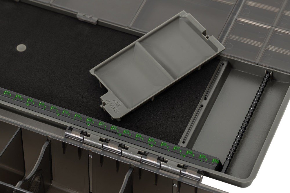 Víko také obsahuje předpřipravenou desku na návazce, jako byste našli v Rig Safe, doplněnou o opracovanou drážkovanou zádržnou tyč na háček. Může uložit až 56 předem navázaných návazců a je dodáván s 30 jednoduchými a 20 dvojitými kolíky, které je pevně zajistí na místě. Vynalézavost tohoto boxu zde nekončí, deska návazců obsahuje inovativní tyč na návazce, která uloží Spinner Booms. Toto je něco, co Damian Clarke vymyslel k použití ve svém vlastním Rig Safe, ale nyní byla podobná myšlenka vyvinuta i pro Large Tackle Box. Pro dokončení návazcové desky je zde hi-vis pravítko, které vám pomůže sestavit návazec s dokonalou délkou.