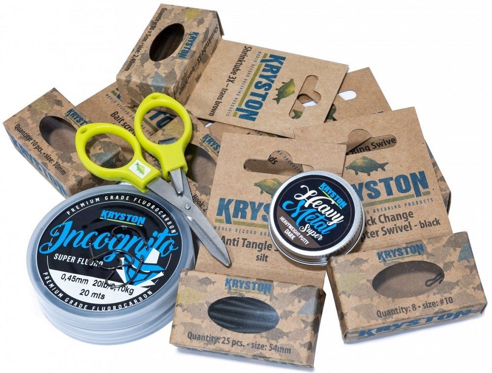 Díky tomuto balení ušetříte přes 30 % z klasických prodejních cen a navíc získáte zdarma háčky, samolepky a nůžky Kryston! Balení obsahuje: - Fluorocarbon Incognito 20 lb 20 m - Heavy Metal černý - Háčkové zarážky černé 25 ks - Smršťovací hadička hnědá 2,4 mm - Zavrtávací držák 10 mm - Mini obratlík s kroužkem 10 ks - Krytky proti zamotání dlouhé černé 25 ks - Rychlovýměnný Ronnie obratlích s kroužkem 10 ks - Skládací nůžky Kryston - Originální háčky Kryston Curve X, vel. 6 - Samolepky Kryston - Samolepka Snakebite.