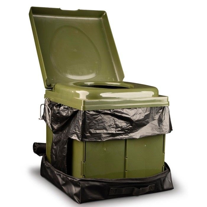 Odolné přenosné pouzdro slouží nejen k bezpečnému uložení všech částí, ale díky voděodolnému, snadno omyvatelnému materiálu jej lze použít i jako ochrannou podložku pod sestavenou toaletu – ideální ochrana proti vlhké nebo znečištěné zemi. Horní klopu lze srolovat, zastrčit a zajistit suchým zipem uvnitř pouzdra, případně ji ponechat rozloženou a využít jako suchý povrch pro odložení vybavení.