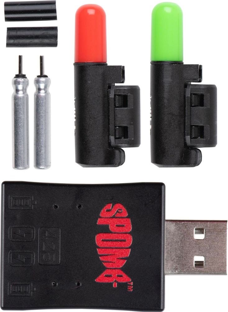 Součástí balení jsou dvě barevné varianty světla (červená a zelená), baterie CR425, USB nabíječka se dvěma nabíjecími a dvěma úložnými porty a silikonové návleky. Ty se nasazují na dřík Spombu a zajišťují lepší uchycení i stabilitu při nahazování.