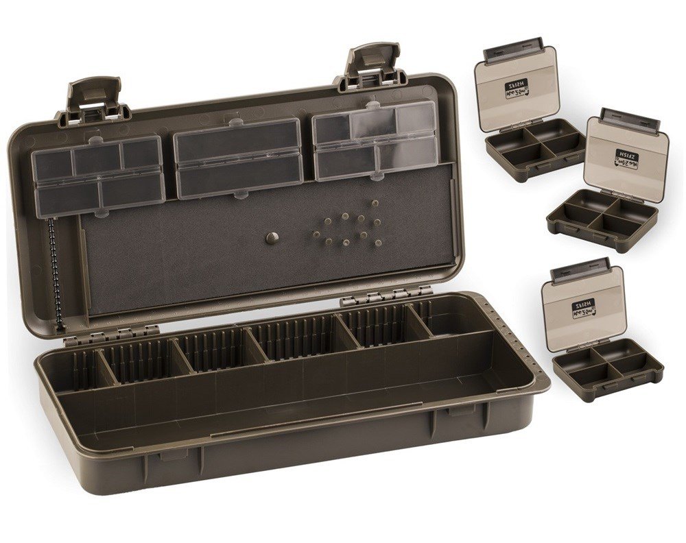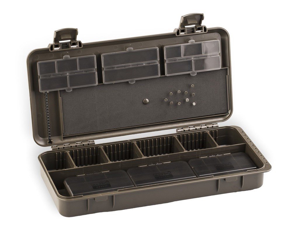 Další vychytávkou u tohoto konkrétního modelu tackle boxu je integrovaná děrovaná lišta pro zavěšení hotových montáží umístěná na jedné z kratších stran spodní části boxu. Celkové rozměry boxu jsou 350 x165 cm s hloubkou 50 mm, takže spolehlivě pojme drobnou bižuterii včetně pomůcek pro samotné vázání návazců a montáží, jako jsou nůžky, kleště, jehly, utahovače uzlů apod. Nadstandartní výbavou tohoto pořadače jsou další 3 menší samostatné krabičky o velikosti 102 x 80 x 24 mm s 4, 6 a 8-mi přihrádkami. Jednoduchý a čistý design se zkosenými a oblými hranami nejen skvěle vypadá, ale díky oblým tvarům je i samotná manipulace mnohem příjemnější. Celkově výborný dojem už jen podtrhují odolné materiály, jednotlivé komponenty ve velmi elegantním, temně olivově zeleném provedení. Tento organizér využijete při většině rybolovných technik, především však při kaprařině a feederu.